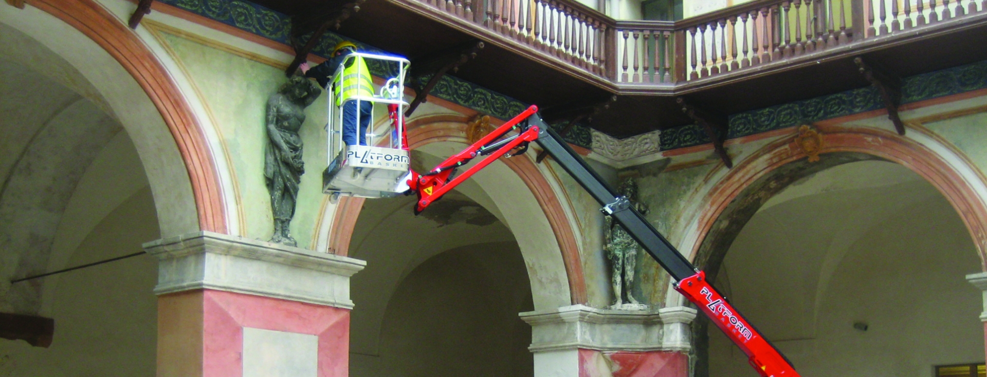 The Platform Basket “spider” range is an excellent choice for restoration work. Thanks to their compact size, Platform Basket industrial aerial working platforms can reach even the narrowest spaces, moving with precision inside buildings that require special care and attention. These models offer extremely silent and efficient operation and are simple to use and well-protected against falling objects. What’s more, traditional batteries or lithium-ion batteries powering single- or three-phase electric motors – the ideal solution for indoor works – are available for the entire range in addition to the high-quality tier 4 gasoline or diesel combustion engines.